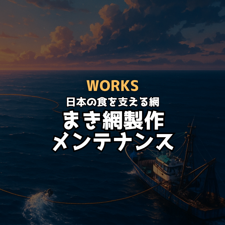 1艘巻・2艘巻のまき網(旋網)漁法に対応した網の製作・メンテナンスに豊富な実績があります。全長約…